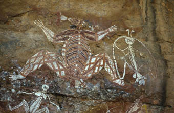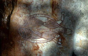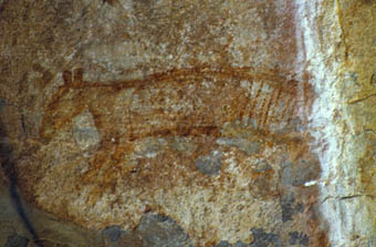 An den Felswänden ( hier des Nourlangie-Fels ) finden sich noch häufig die bis zu 20 000 Jahre alten Zeichnungen der Aborigenes. Die Farben wurden aus zu Pulver zerstossenen Mineralien hergestellt, die anschließend mit Harzen vermischt wurden. ( rot-Hämatit, gelb-Limonit, weiß-Tonerde, schwarz-Holzkohle ) | |