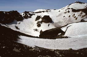 Gegen 7.00 Uhr kamen wir am Kraterrand an. Nach einer längeren Verschnaufpause in einem windgeschützten Winkel fanden wir nach mehrstündigem Suchen, wobei wir mehrmals den Krater durchqueren mußten, endlich einen Pfad, der uns hinabführen könnte. Gegen 11.00 Uhr Beginn des Abstiegs. | |