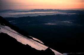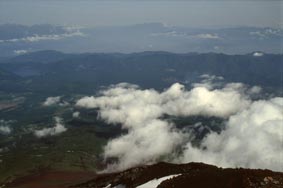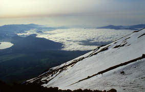 Nur während zweier Monate vom 1.7. bis 31.8. ist es möglich, den Fujiyama zu besteigen. Daher lag unserer Aufstieg am 10./11.6.1991 drei Wochen vor dem ersten Termin, weshalb die möglichen Wege im oberen Bereich vereist und wegen Schnee nicht mehr erkennbar waren. | |