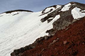 Blick auf ein großes Schnee- und Eisfeld, wo sich der eigentliche Pfad ungefähr hätte befinden müssen. In den hohen Lagen des Vulkans lag der Schnee oft noch etwa 1 m tief, vereinzelt sogar bis zu 3 m. | |