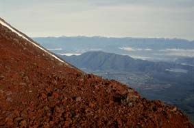 Gegen 14.00 Uhr wanderte ich zusammen mit Gerrit Fröhlich vom Kawaguchi-See aus los (ca.18km Fluglinie vom Kraterrand). Zuerst ging es quer durch den Urwald, dann durch Sträucher, immer direkt in Richtung des Kraters bis zur 5.Station auf einer Höhe von etwa 2500m - kurz vor Sonnenuntergang gegen 19.00 Uhr. | |
