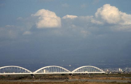 Der 110 km entfernt liegende Fujiyama von der Hauptstadt Tokyo aus gesehen. | |